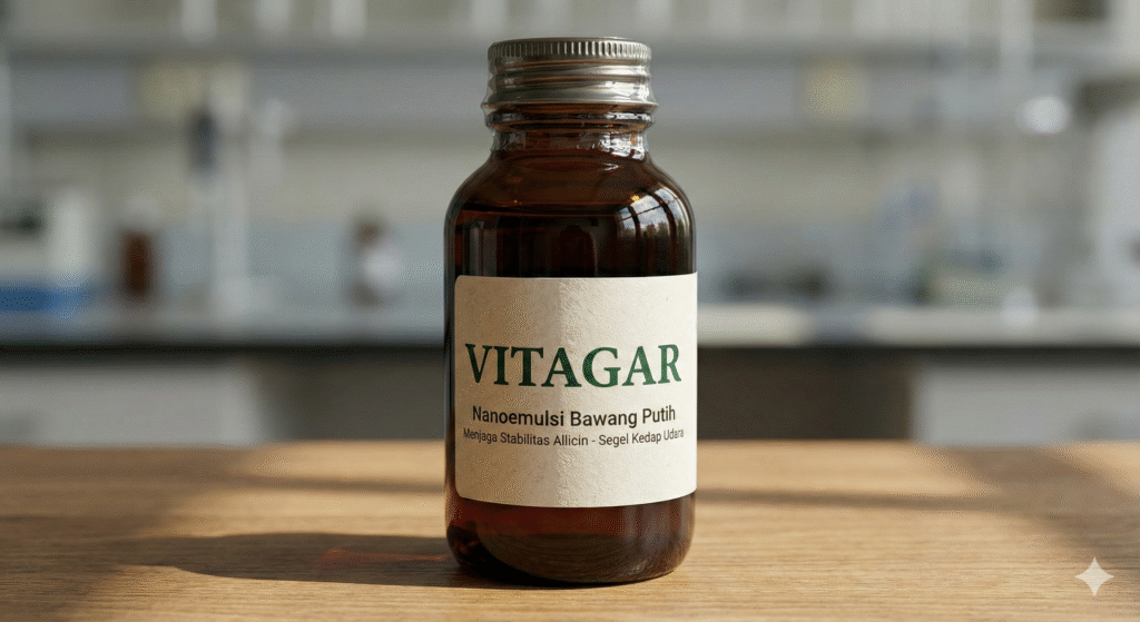 VITAGAR adalah suplemen pakan (feed additive) alami berbasis fitobiotik cair yang diformulasikan khusus untuk peternakan ayam broiler modern. Mengandung Garlic Essential Oil (Minyak Atsiri Bawang Putih) murni yang diproses menggunakan Teknologi Nanoemulsi, menjadikan VITAGAR solusi terdepan untuk pengganti antibiotik (AGP) dan pemicu pertumbuhan alami.