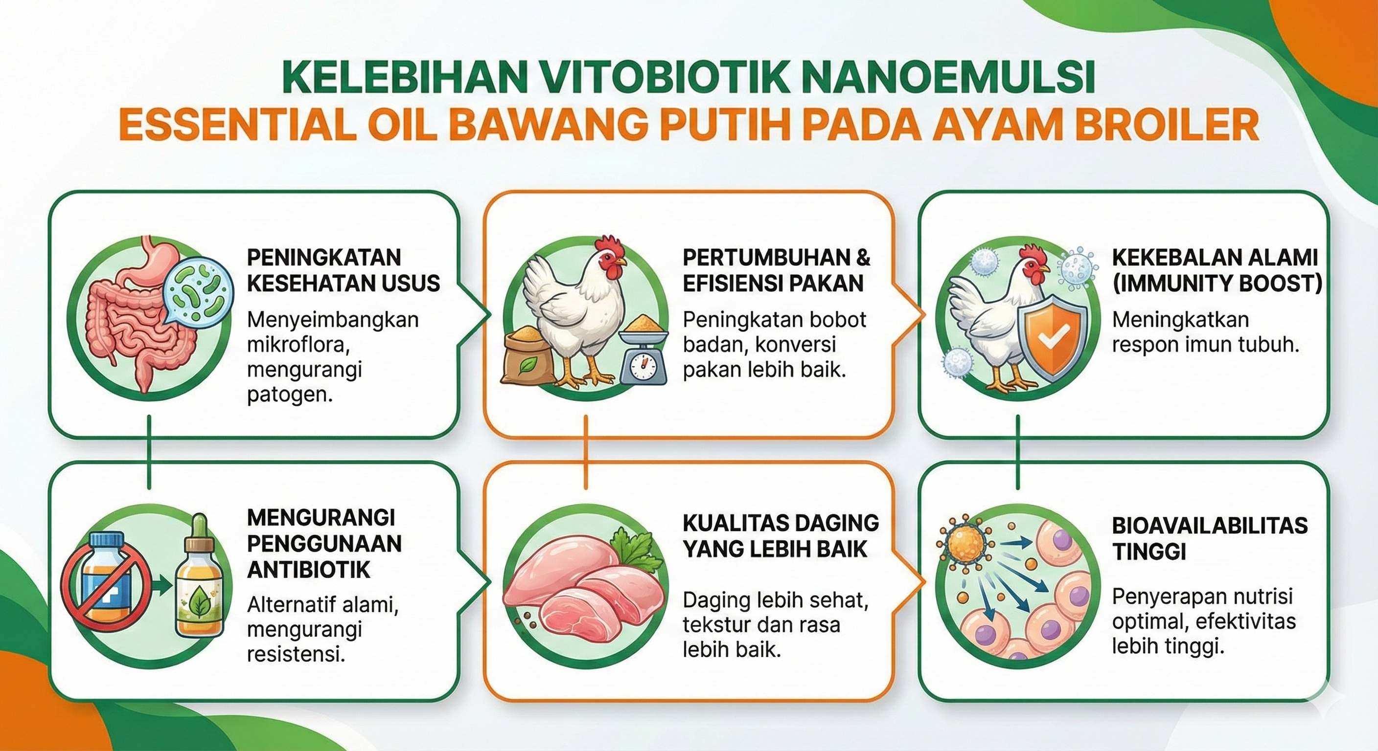 Inovasi Produk: Mengembangkan dan memproduksi fitobiotik (vitobiotik) berkualitas tinggi dengan teknologi nanoemulsi untuk memaksimalkan potensi genetik ayam broiler.